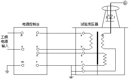 圖3:單臺SSB交直流高壓試驗變壓器工作原理示意圖 使用方法及注意事項 按照圖6所進行的工頻耐壓試驗接好工作線路,抽出短路桿,試驗變壓器的高壓繞阻的X端(高壓尾)、儀表測量繞組的F端、試驗變壓器的外殼以及電源控制箱(臺)的外殼必須可靠接地。